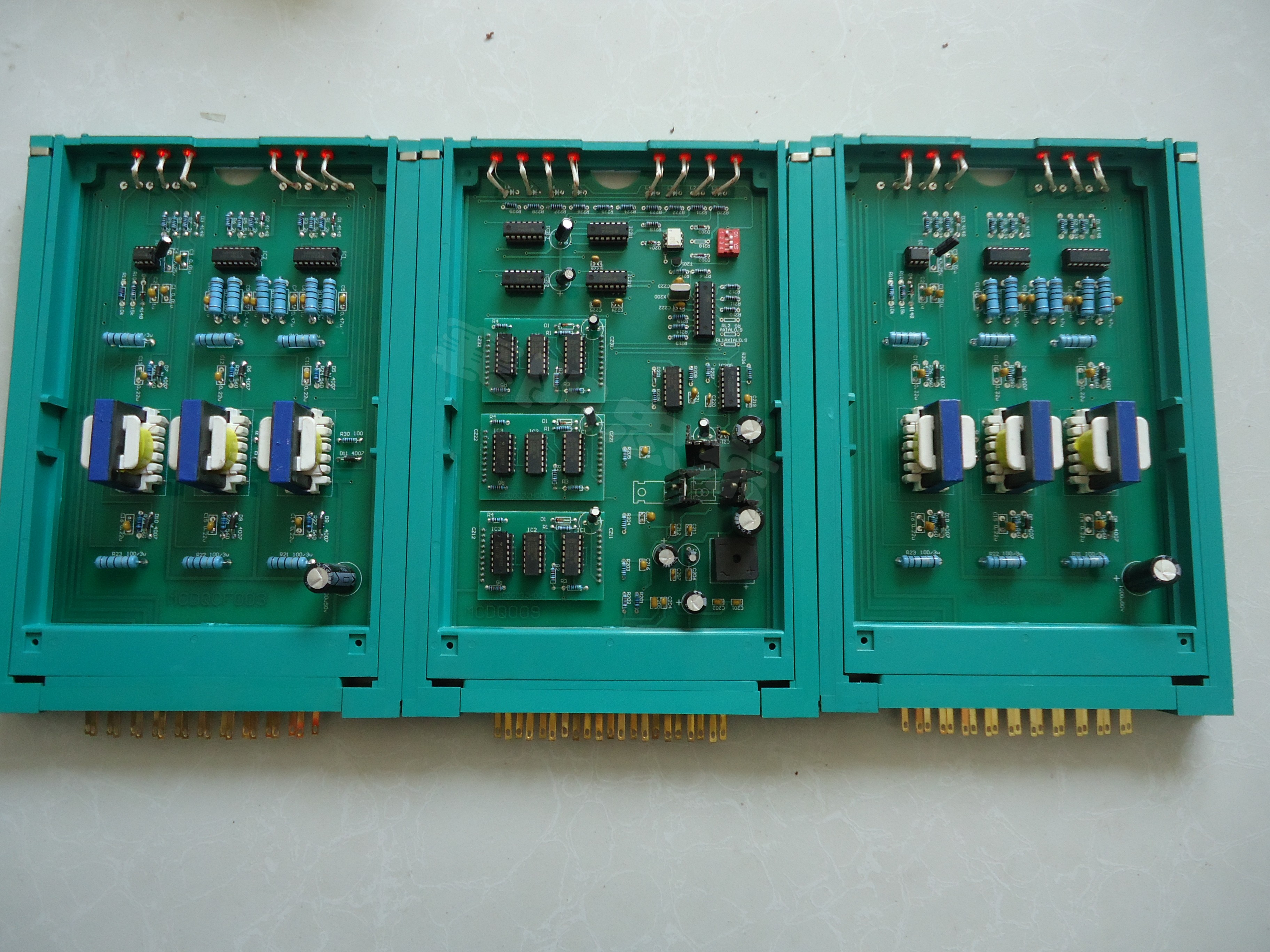 控制板共有三塊,中間一塊一般稱為主控板,兩邊的一般稱為觸發(fā)板。控制板更換必須先斷開進(jìn)相器電源,主控板內(nèi)有四個撥碼開關(guān),其作用是切換進(jìn)相器的運行(電機(jī)運轉(zhuǎn))和試驗狀態(tài)(電機(jī)不運轉(zhuǎn)),調(diào)整撥碼開關(guān)時,必須斷開空氣開關(guān)。